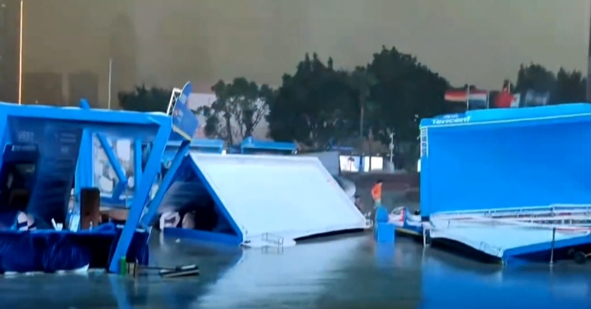 廣州吹起強風,將商場戶外區的攤位全吹垮。(圖/翻攝自微博@Clownyx)