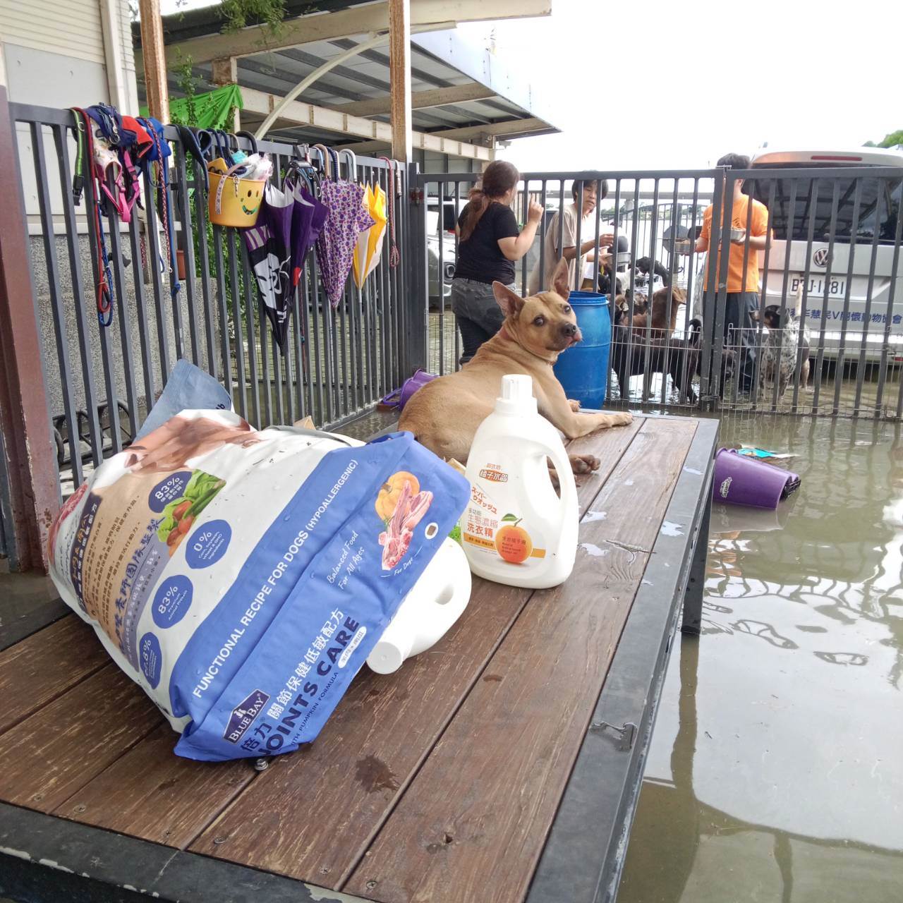 宜蘭冬山鄉三堵二路附近一間流浪動物收容中心,因周遭淹水交通中斷,加上預留物資即將斷炊,情況一度瀕臨危急。有有志工得知情況,自行採購食物和物資徒步涉水運送。