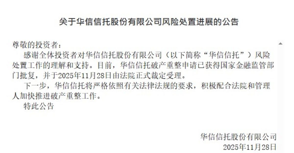華信信託發布公告,確認破產重整申請已獲監管部門批准,並經法院正式裁定受理。下一步,華信信託將嚴格依照相關法律法規的要求,積極配合法院和管理人加快推進破產重整工作。