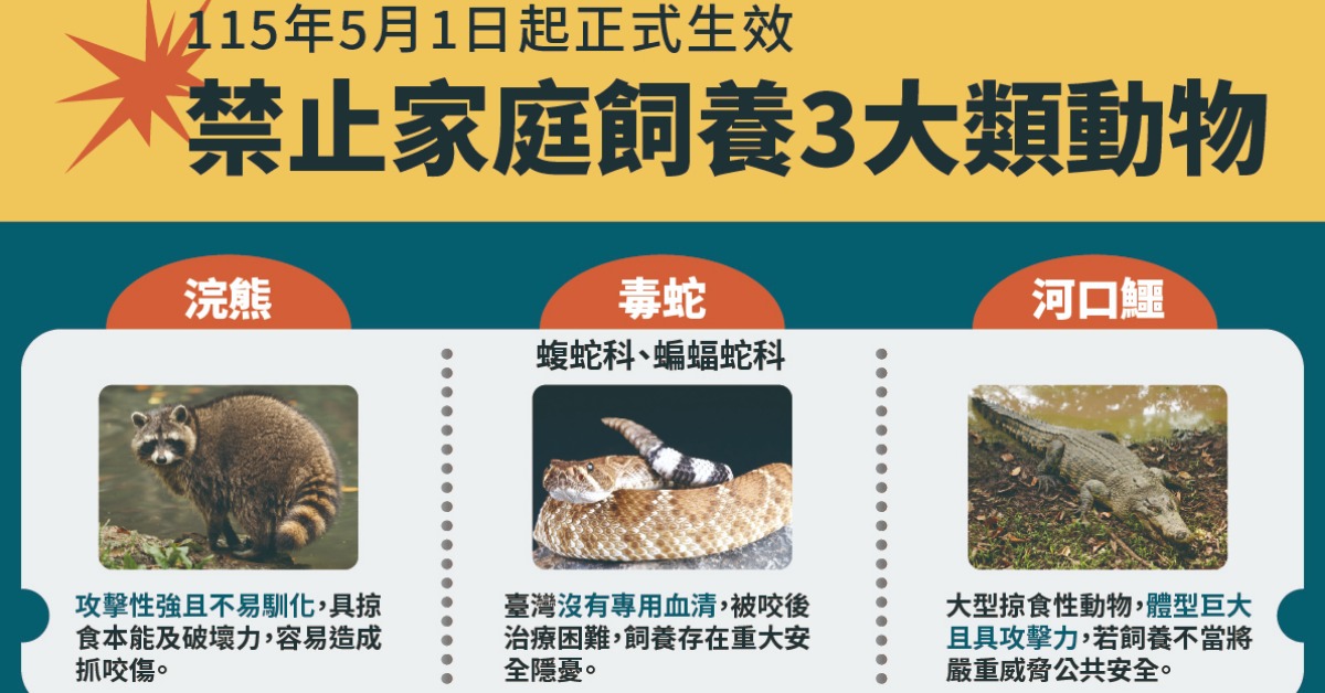 自5月1日起,全面禁止一般民眾飼養包含浣熊、河口鱷、蝮蛇科及蝙蝠蛇科等。 (圖/翻攝自農業部官網)